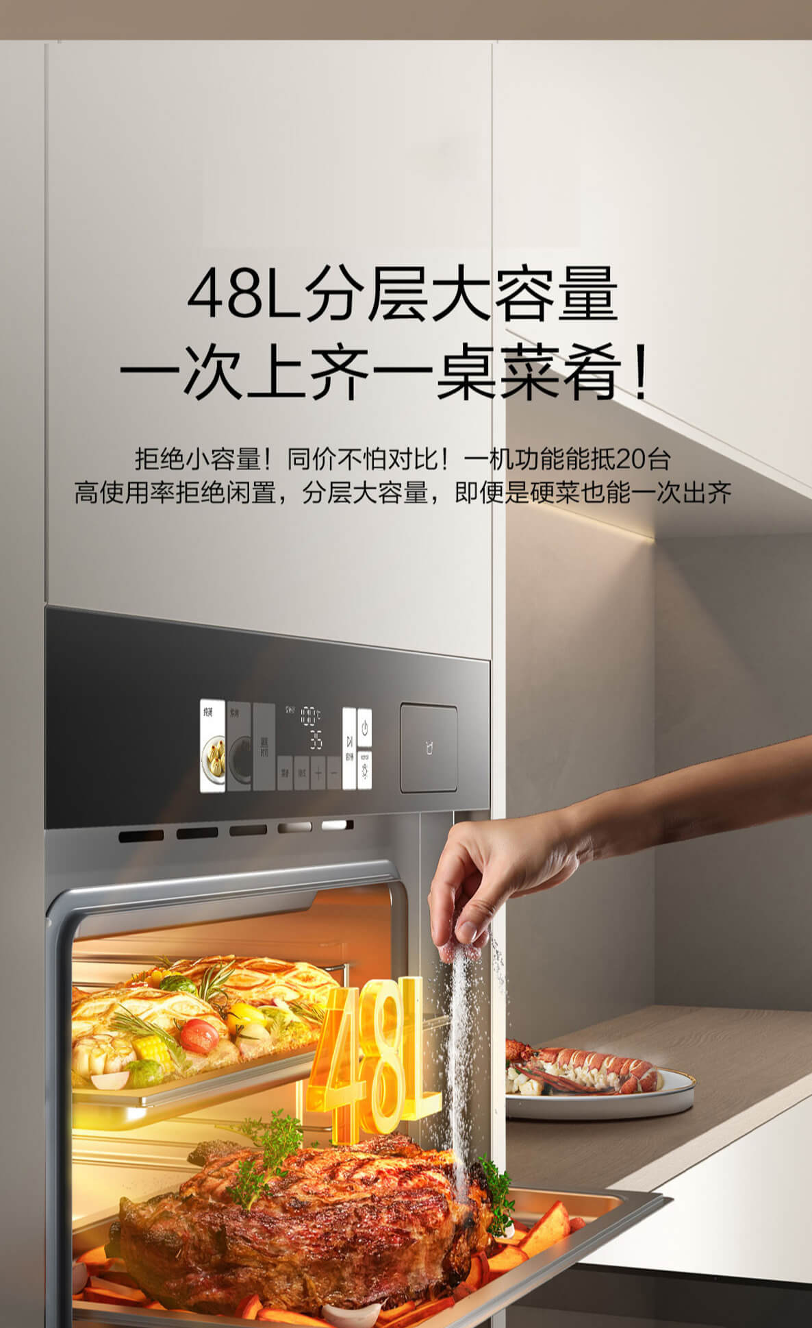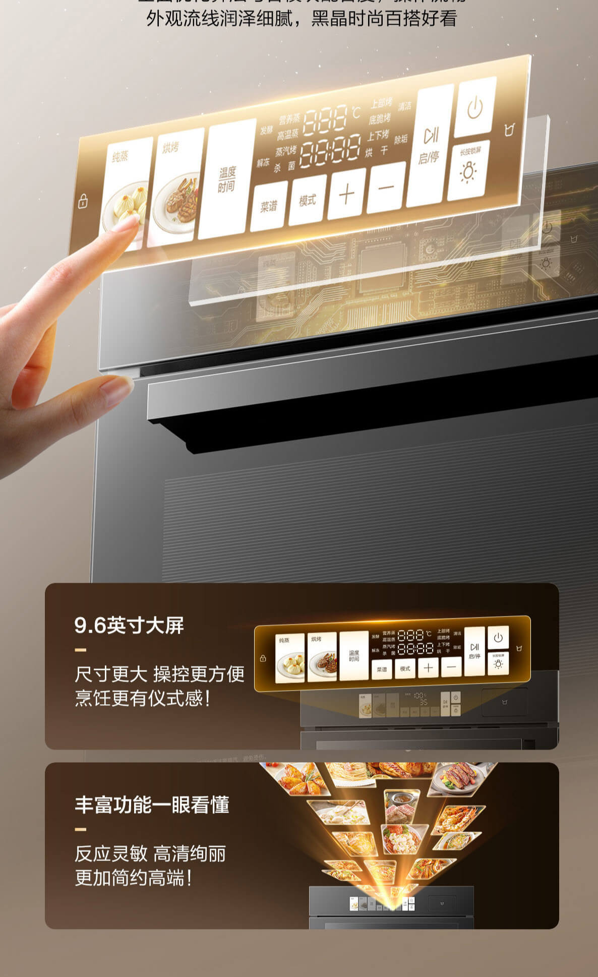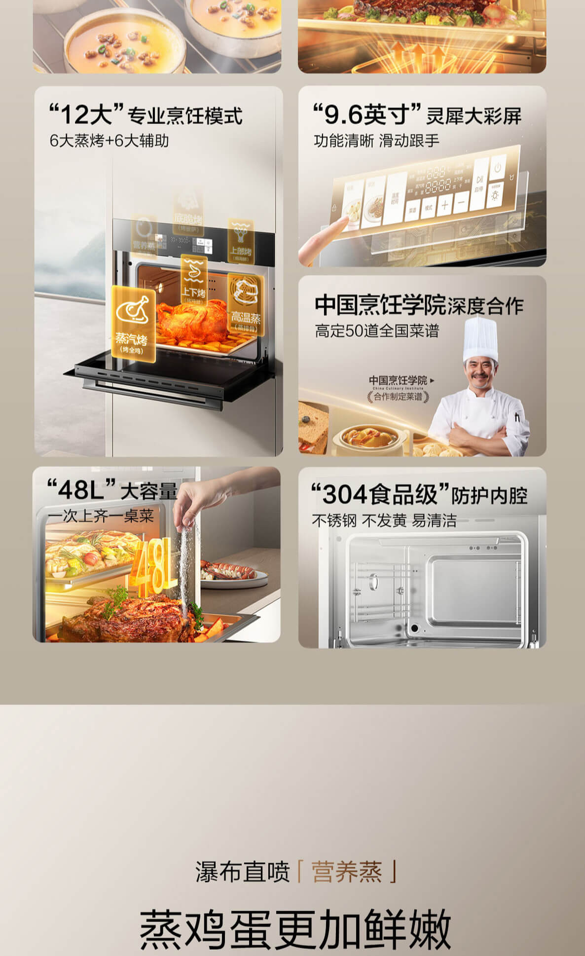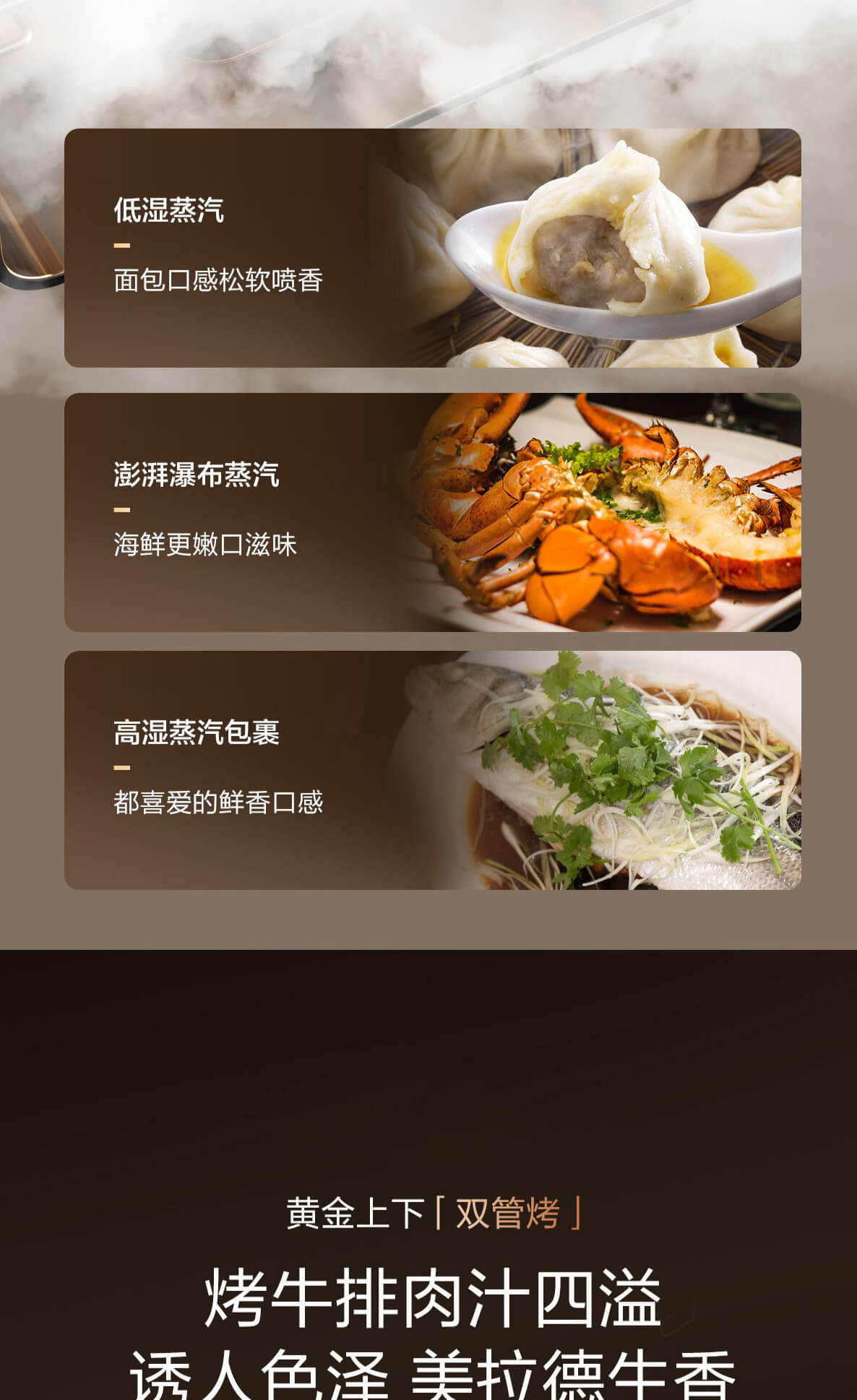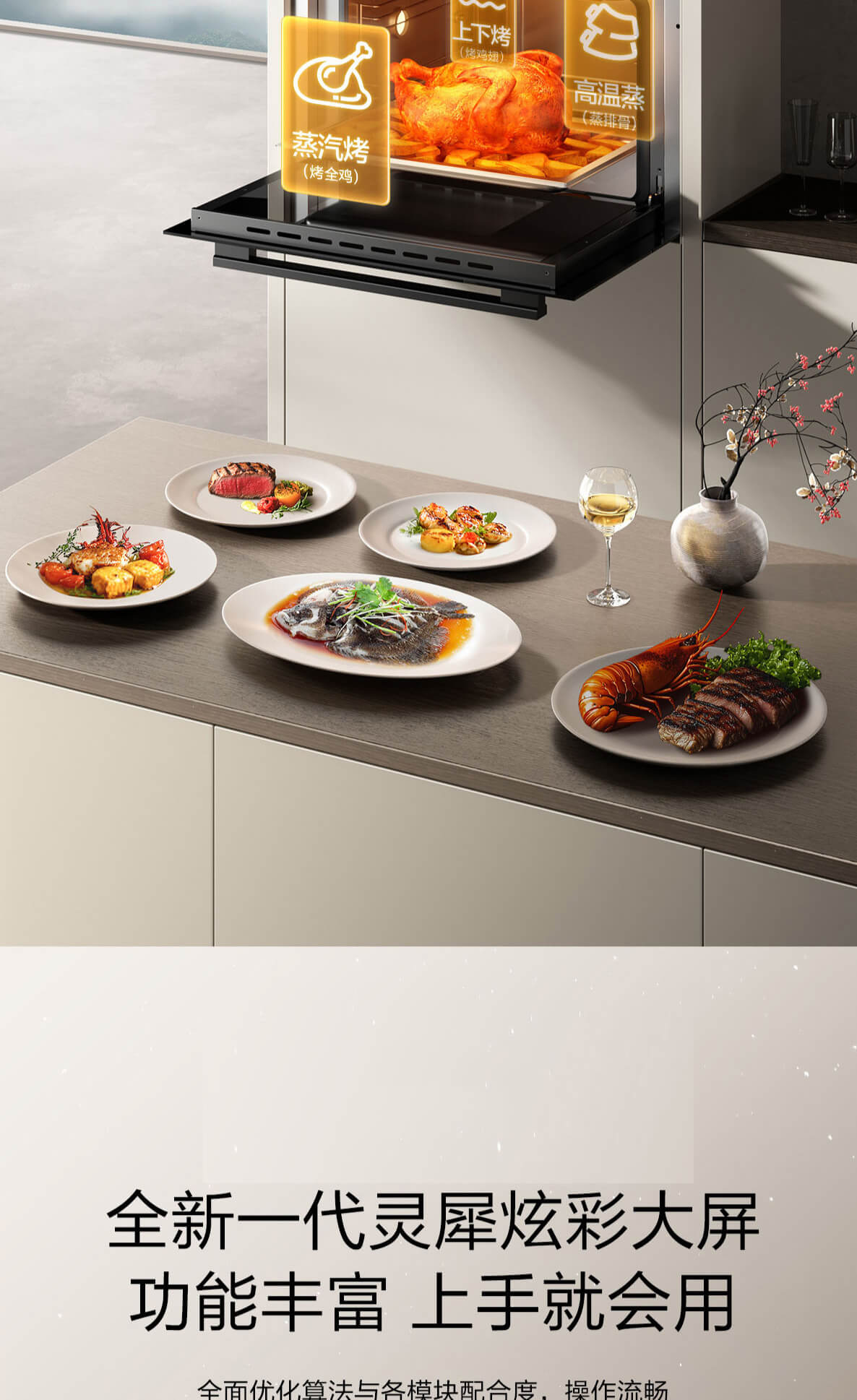 灵犀炫彩大屏,48L大容量,十二大专业蒸烤模式,上下双管烤,直喷瀑布蒸汽,全304食品级不锈钢,一键高温杀菌