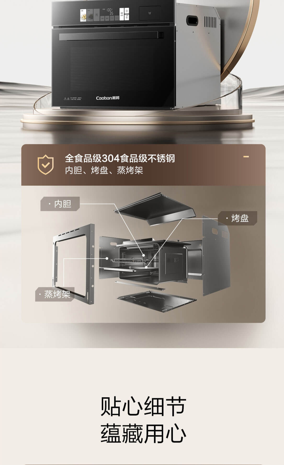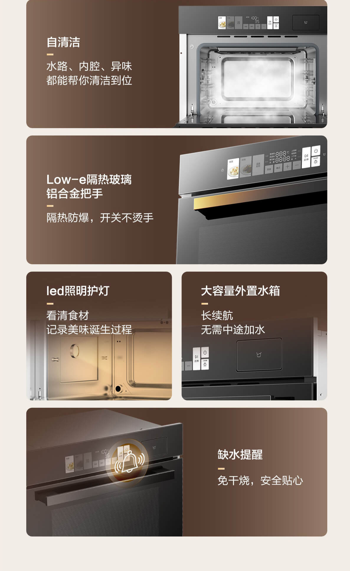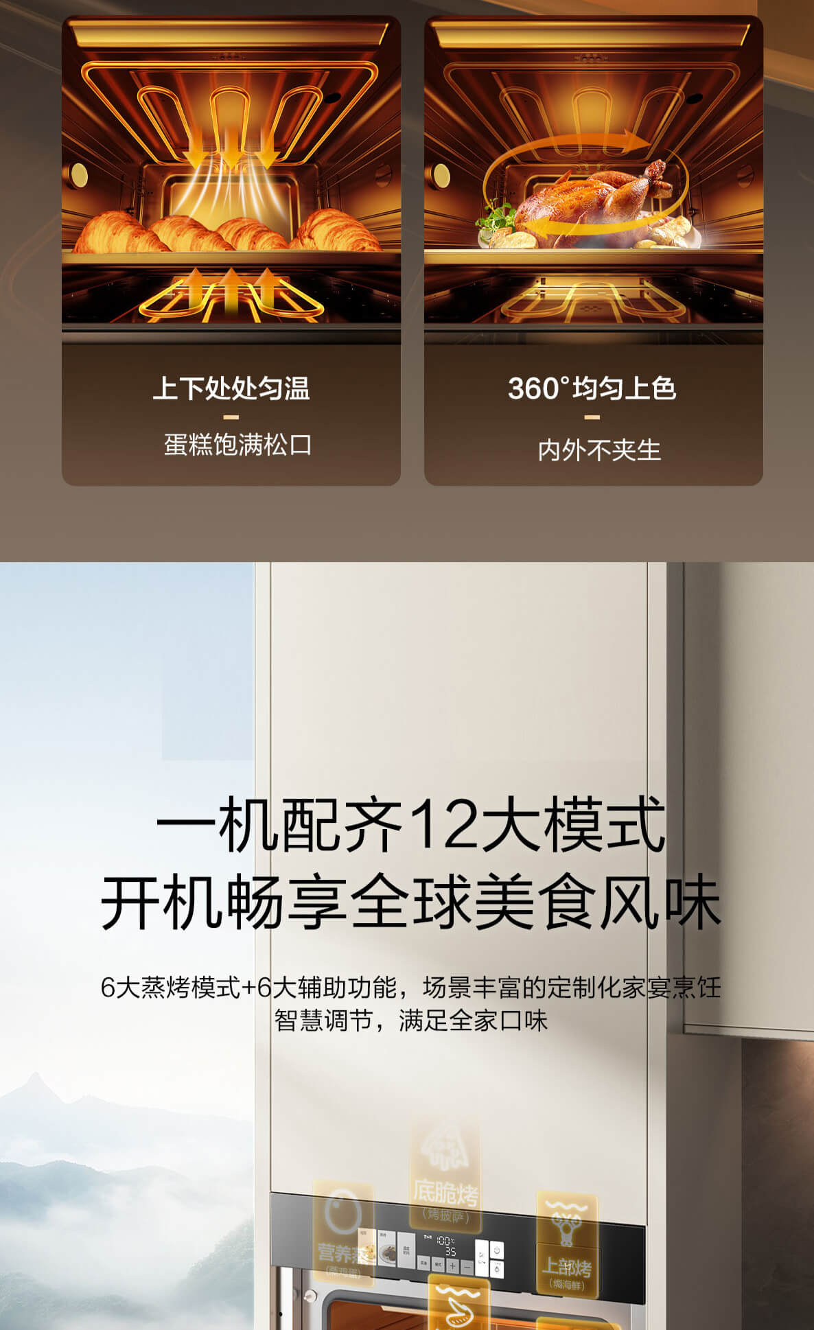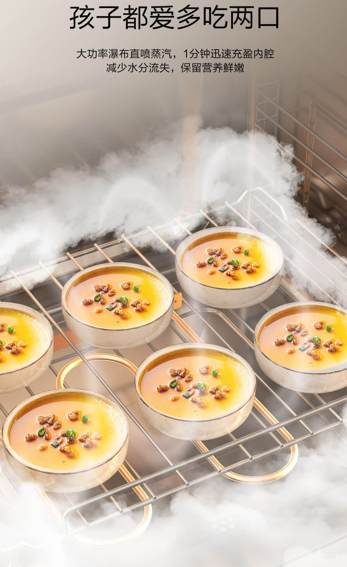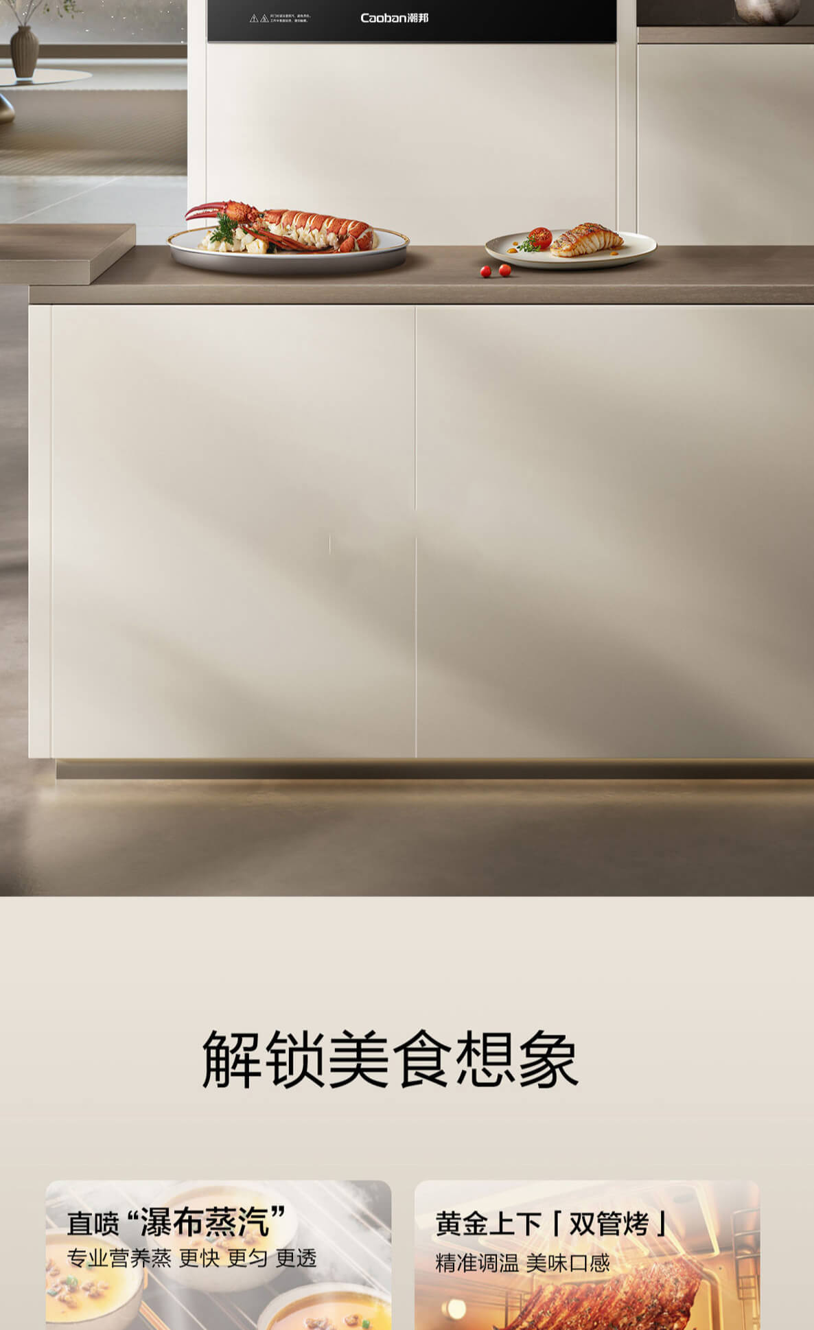 灵犀炫彩大屏,48L大容量,十二大专业蒸烤模式,上下双管烤,直喷瀑布蒸汽,全304食品级不锈钢,一键高温杀菌